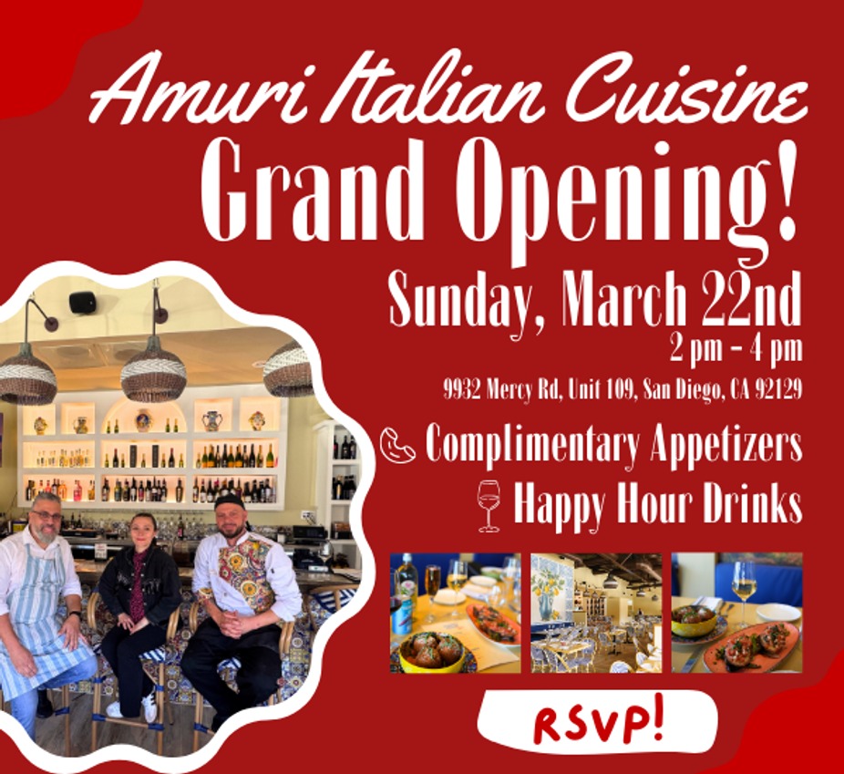 Join us on March 22nd from 2–4 PM as we officially open the doors to Amuri Italian Cuisine. Enjoy complimentary appetizers, happy hour drinks, and an exclusive first taste of our menu. Spots are limited — secure your RSVP today and celebrate with us!https://forms.gle/4WX9dyaG9qDq6CNw8