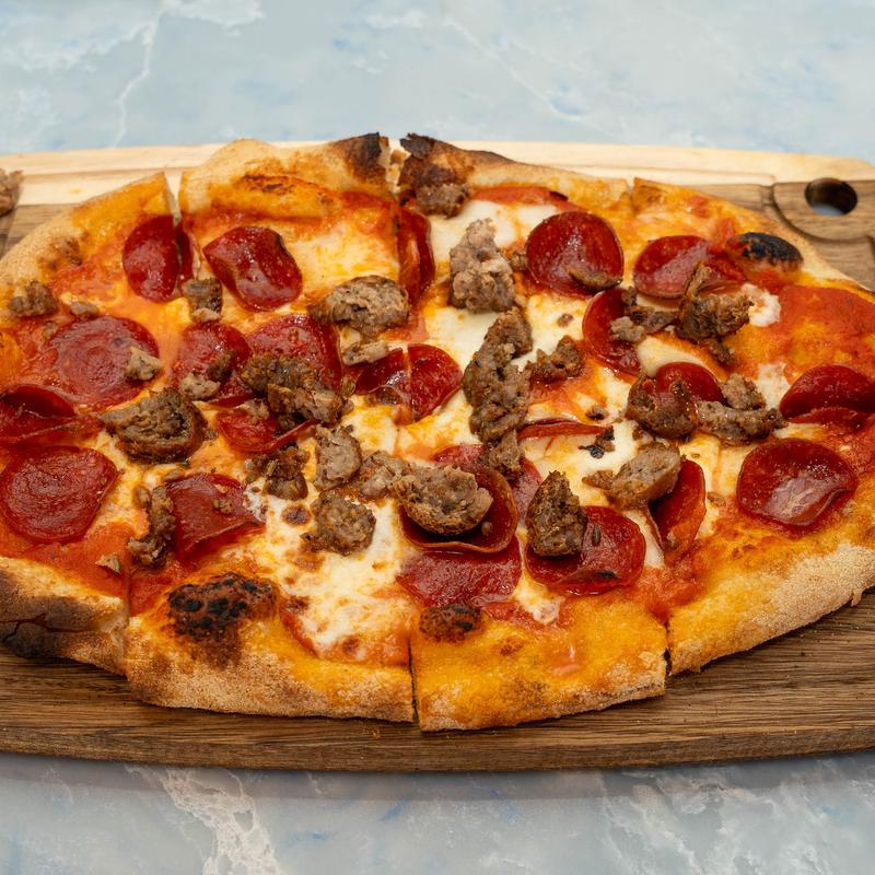 Tomato sauce, mozzarella cheese, artichokes, mushrooms, olives, bell pepper, finished with balsamic vinegar