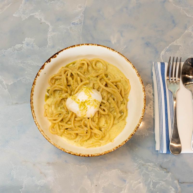 Rigatoni, guanciale, egg yolk, pecorino cheese, black pepper