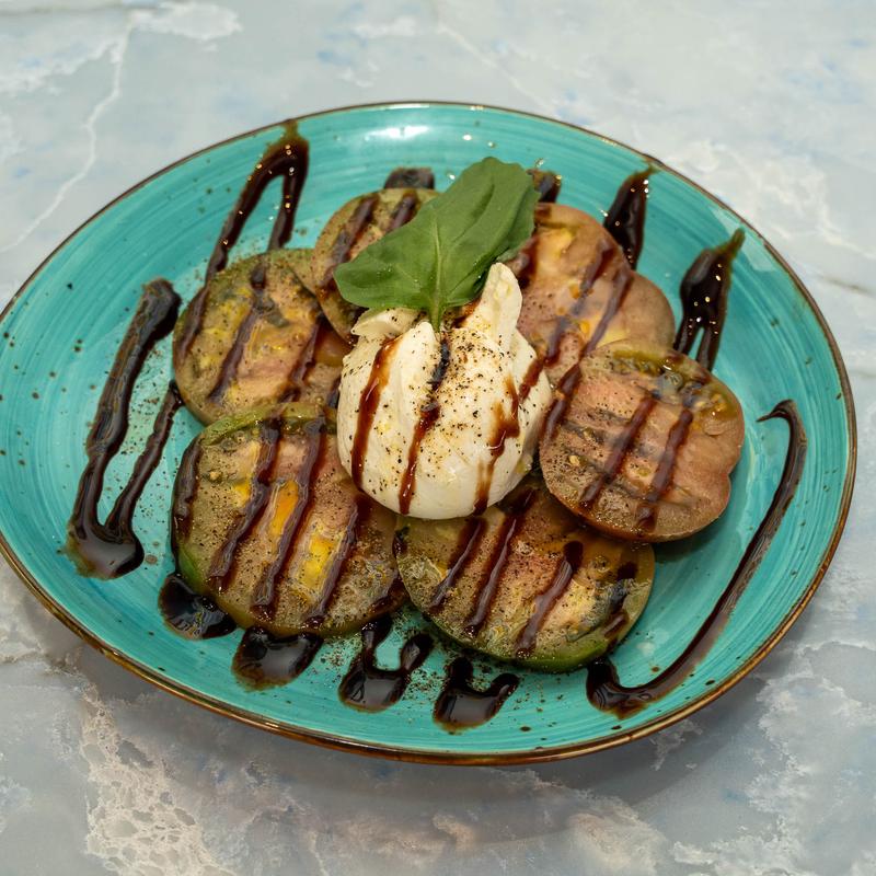 Heirloom tomato, burrata, basil, balsamic vinegar, evoo