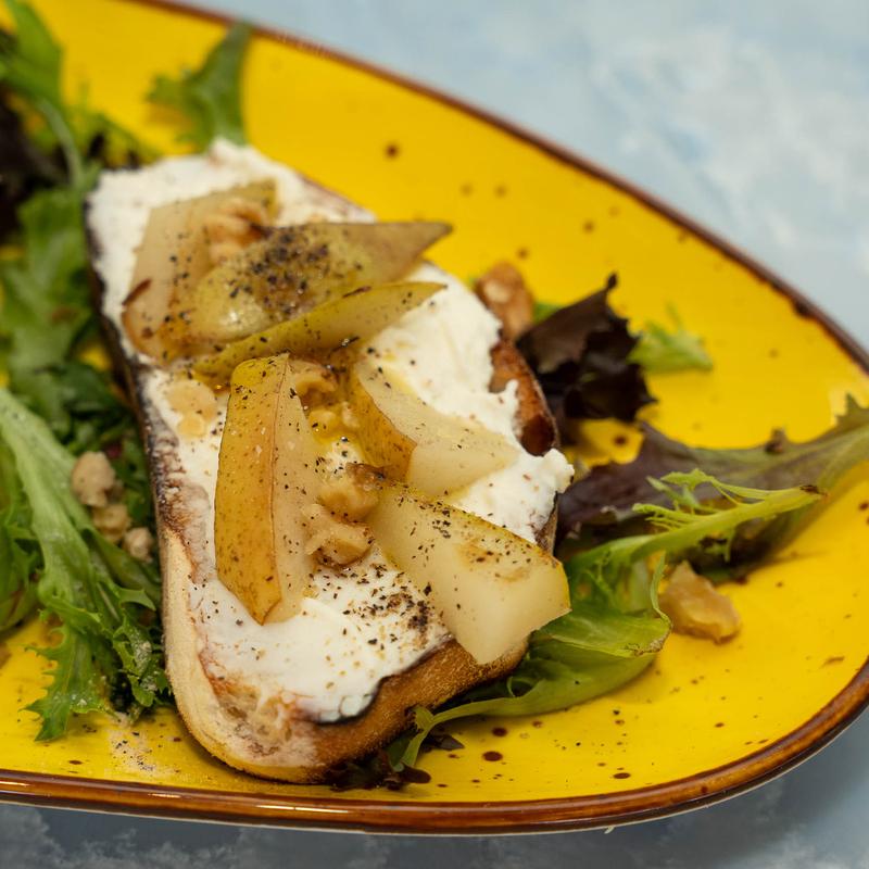 Mix green, pear sliced, walnuts, gorgonzola, dijon vinaigrette