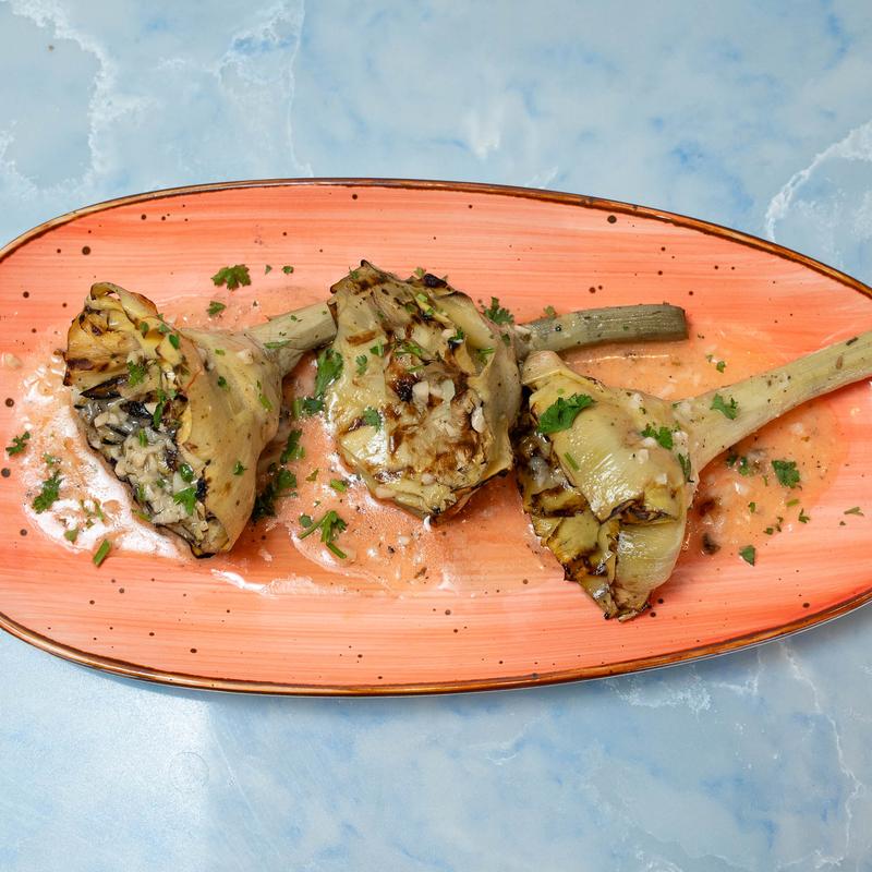 Grilled artichoke hearts, white wine, lemon, and garlic sauce